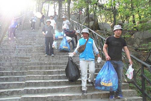 本次活动包括登山和环保捡拾比赛两个部分。活动开始前,所有志愿者从景区领取了“蒙山环保大使”标志,并张贴在上衣显眼位置。在登山过程中,志愿者们做到随身垃圾不落地、路途垃圾随时捡起放入垃圾箱。所有志愿者达到山顶后,在宣传条幅上写下了环保宣言并合影留念。在下山过程中,志愿者们分队进行了环保捡拾比赛。各队在队长和安全员的带领下,把沿途捡拾的垃圾放入环保袋。达到山底后,按比赛规则进行了评比,评出了一、二、三等奖,并举行了颁奖仪式。颁奖仪式结束后,在景区工作人员的带领下,志愿者们将捡拾的16袋垃圾送到指定的存放处。