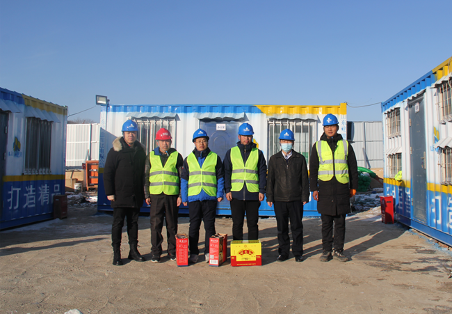 在工地现场,张方贵主席、张立臣副总经理详细了解了一线职工的工作和生活情况,给生产一线职工发放了节日慰问品,同时强调要加强疫情防控期间安全生产工作,确保优质高效完成工程项目。