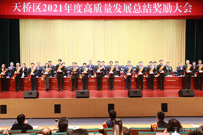 2月27日上午,济南市天桥区2021年度高质量发展总结奖励大会召开。区委书记韩伟出席会议并讲话,区委副书记、区长张庆国主持会议。大会对获奖企业、单位和个人代表进行了表彰,山东德赢·vwin体育集团有限公司公司党委书记、董事长杨耀东获得“2021年度经济建设功勋奖”荣誉称号。